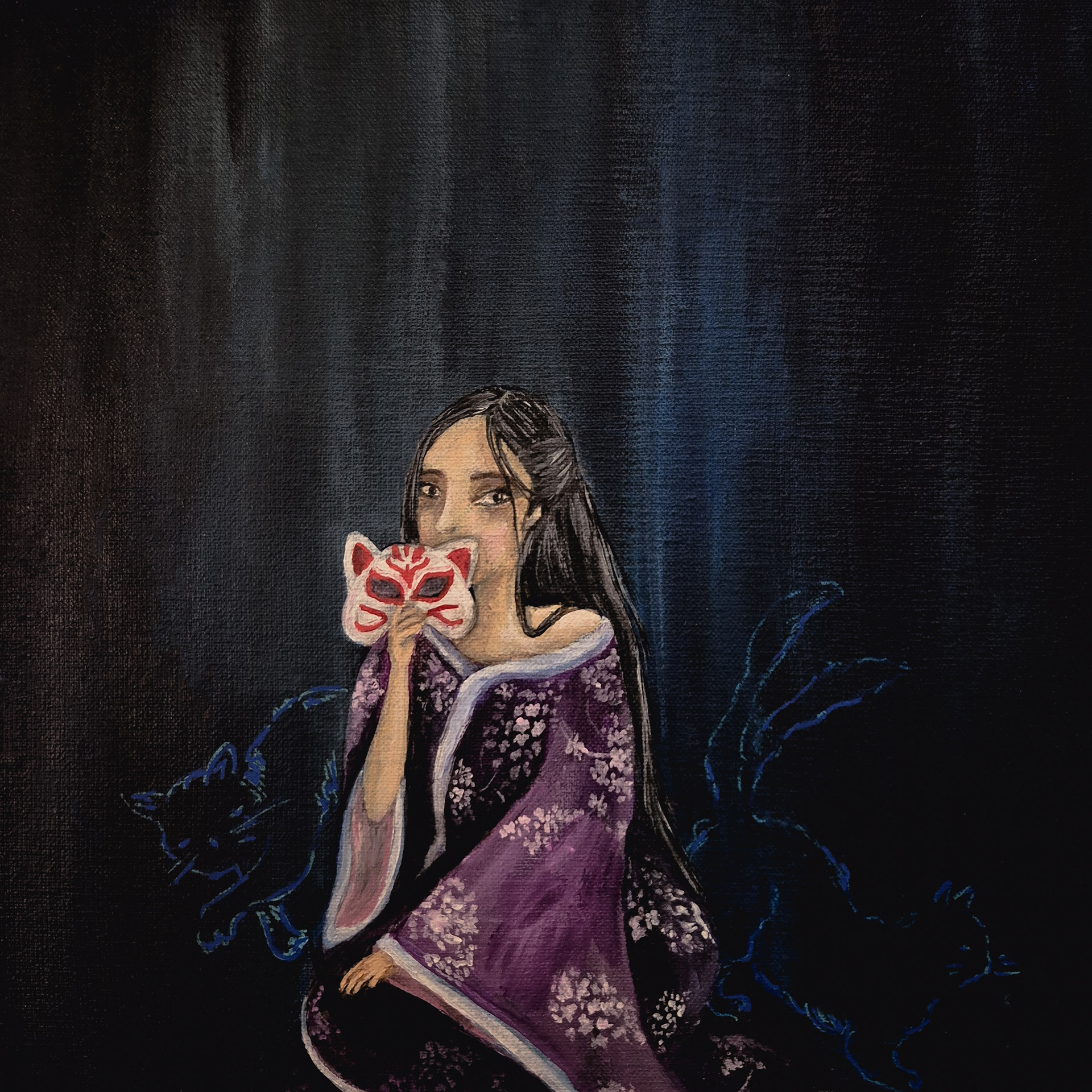 Ilustración realizada en acrílico sobre bastidor 20x20 cm. La obra está inspirada en la leyenda japonesa del Nekomata, un gato sobrenatural de dos colas asociado a la transformación, la dualidad y el vínculo entre el mundo humano y el espiritual. La composición explora la identidad, lo oculto y las presencias que habitan en lo invisible.